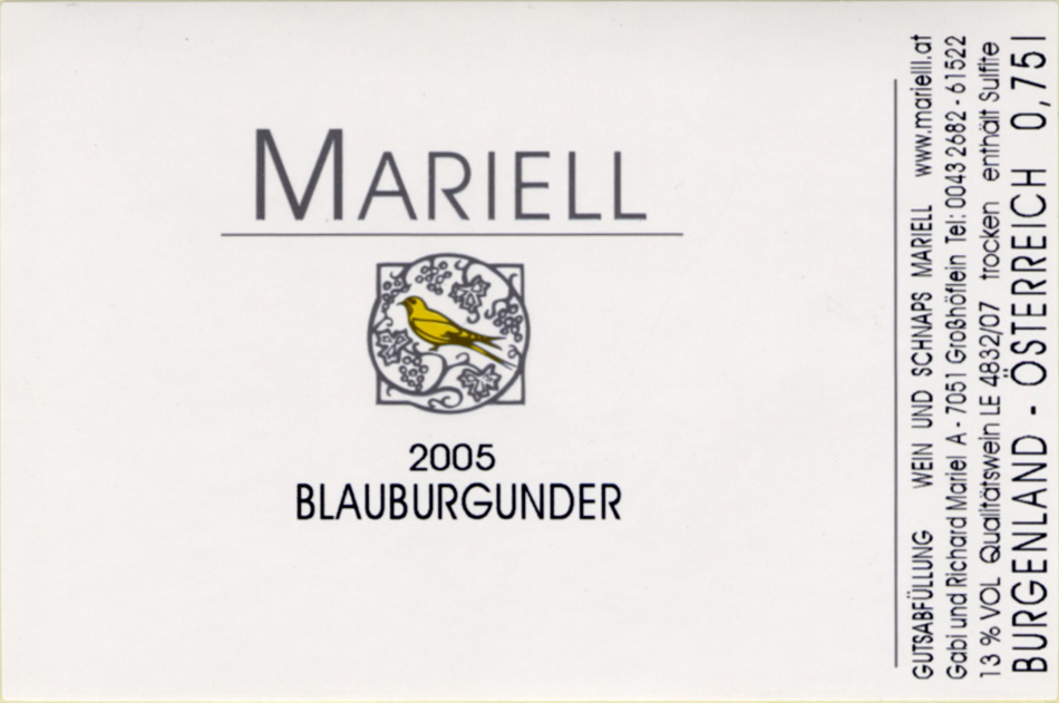 Mariell, Blauburgunder, 2008 $21.75SKU: MA-026List price: $21.75Price: $21.75Weight: 3 lb Quantity * Catalog: Mariell$10-25Austria750mlRedBlauburgunder2008