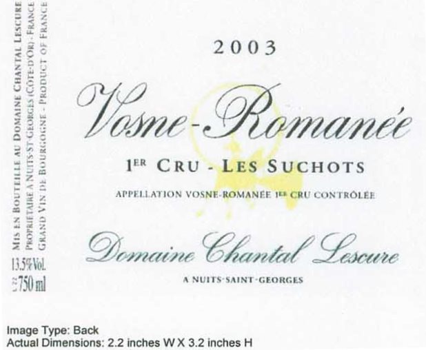 Domaine Chantal Lescure, Vosne Romanee, 1er Cru, Les Suchots, 2013 $175.00SKU: DL-145List price: $175.00Price: $175.00Weight: 3 lb Quantity * Catalog: Chantal LescureOver $100FranceRedBurgundy2013