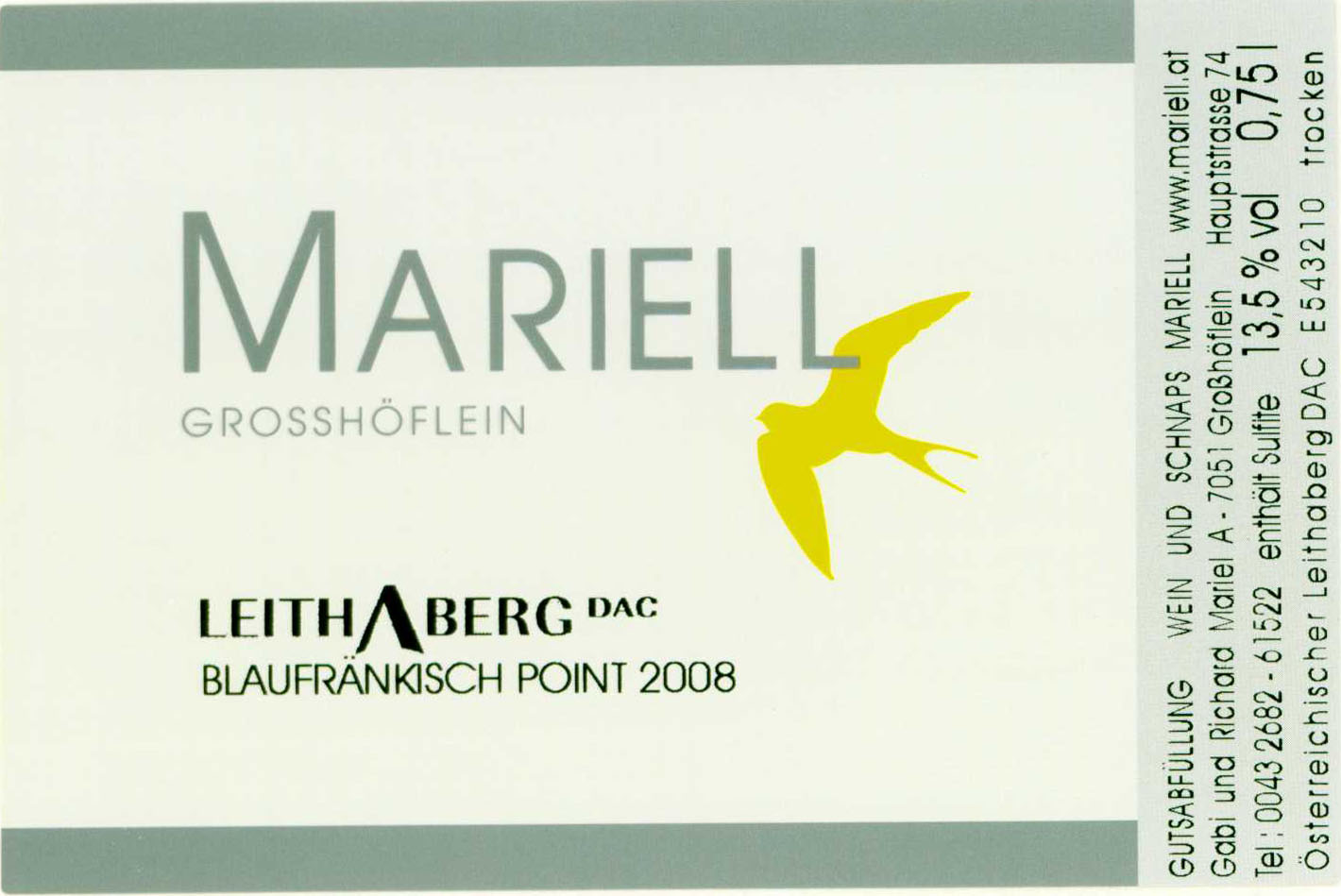 Mariell Blaufrankish Leithaberg Point, 2013 $35.00SKU: MA-038List price: $35.00Price: $35.00Weight: 3 lb Quantity * Catalog: MariellAustria750mlRedBlaufrankish