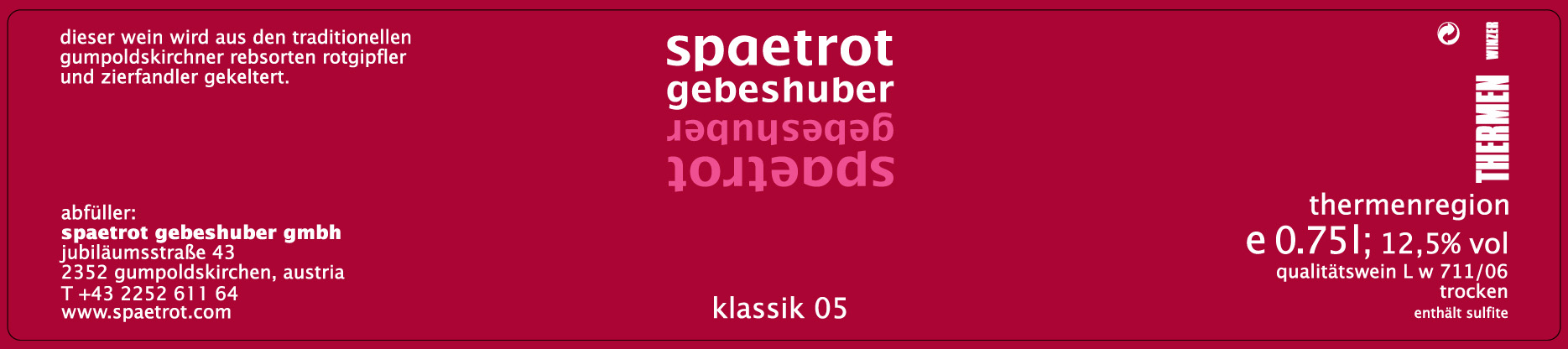 Spaetrot-Gebeshuber$10-25Austria750mlWhiteOther Austrian2011 Spaetrot Gebeshuber, Klassik Weiss, 2011. A blend of 50% Zierfandler and 50% Rotgipfler.