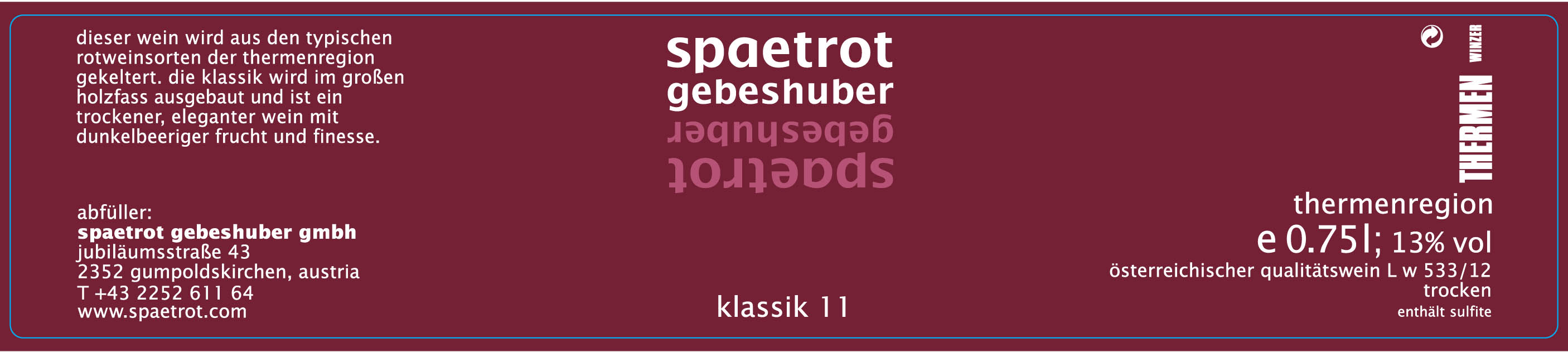 Speatrot Gebeshuber, Klassik Rot 2012 $20.00SKU: SG-027List price: $20.00Price: $20.00Weight: 3 lb Quantity * Catalog: Spaetrot-Gebeshuber$10-25Austria750mlRedOther Austrian2012