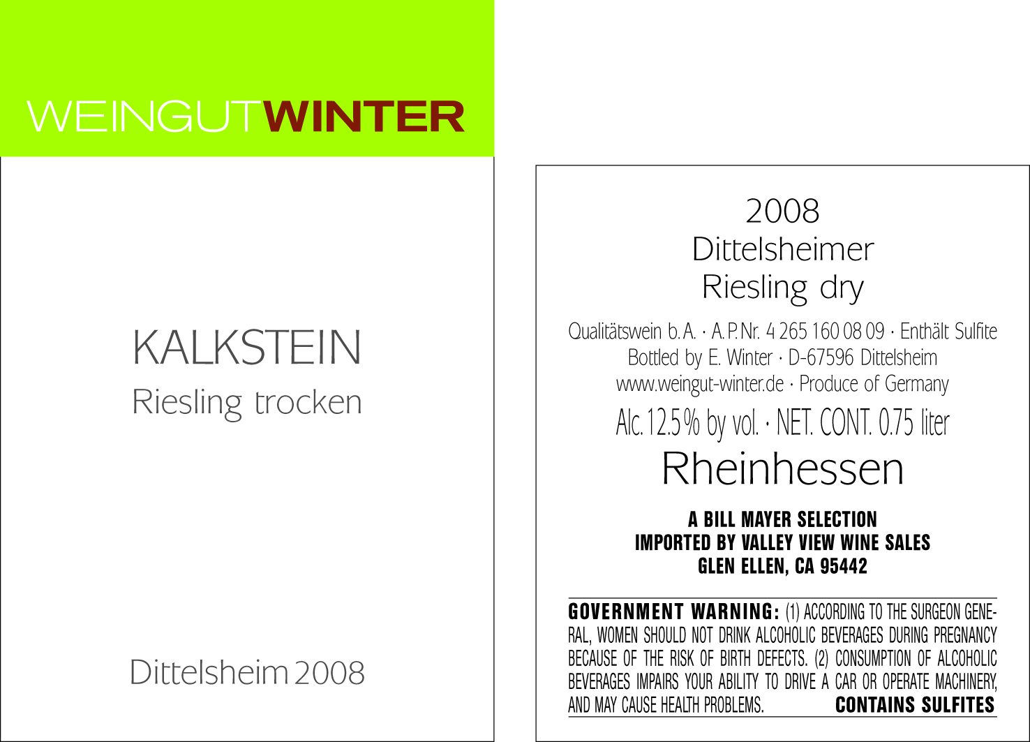 <p> Winter Riesling Kalkstein 2008</p> $28.25SKU: WI-012List price: $28.25Price: $28.25Weight: 3 lb Quantity * Catalog: Winter$10-25Germany750mlWhiteRiesling2008